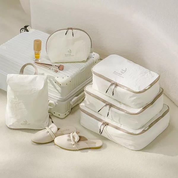 Travel Organization & Comfort: Packing cubes, compression bags, travel pillows, sleep masks, toiletry kits, and portable hygiene solutions.