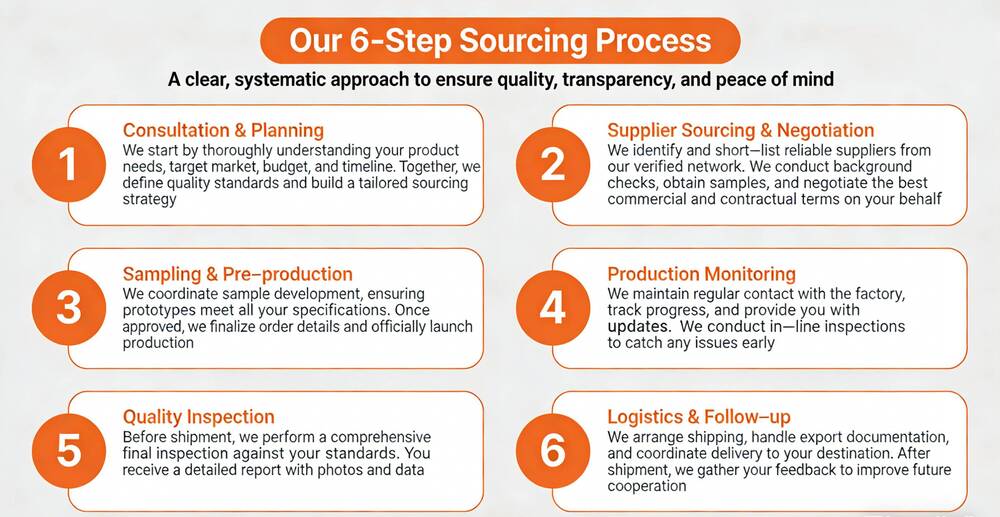 This end-to-end solution covers every step of your sourcing journey: from initial consultation, supplier matching & negotiation, sample development, production monitoring, quality inspection, to final logistics & delivery.